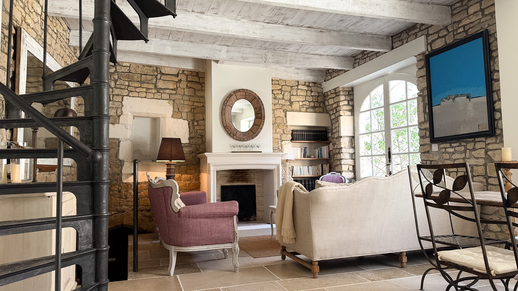 À l’intérieur, la pierre apparente révèle tout le caractère du lieu. Elle enveloppe les espaces d’une chaleur authentique, créant une ambiance à la fois cosy, élégante et rassurante.