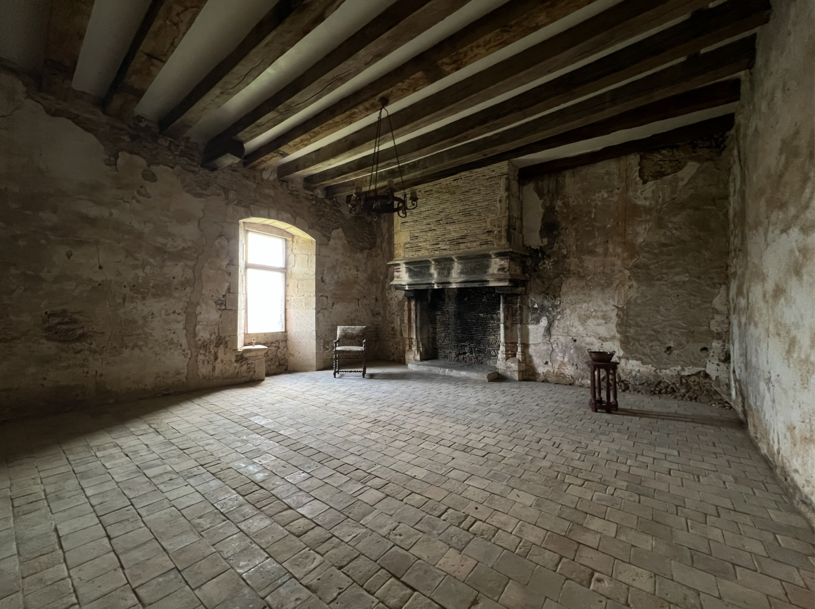Au rez-de-chaussée, une entrée desservant un water-closet, une chambre. À droite de l’entrée, une cuisine offrant une vue sur le château. À gauche le salon avec sa majestueuse cheminée.