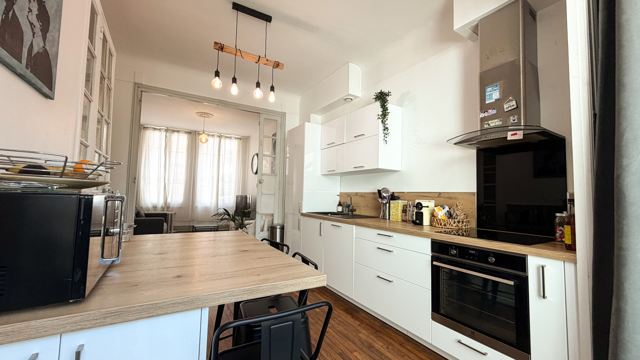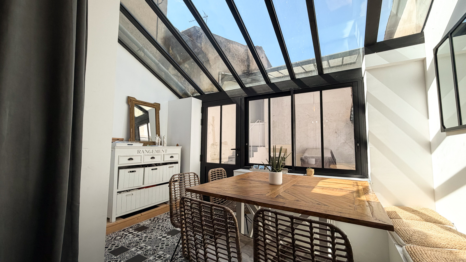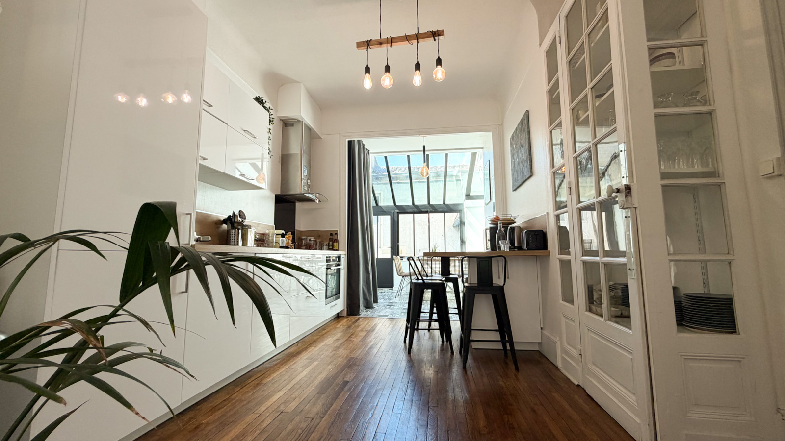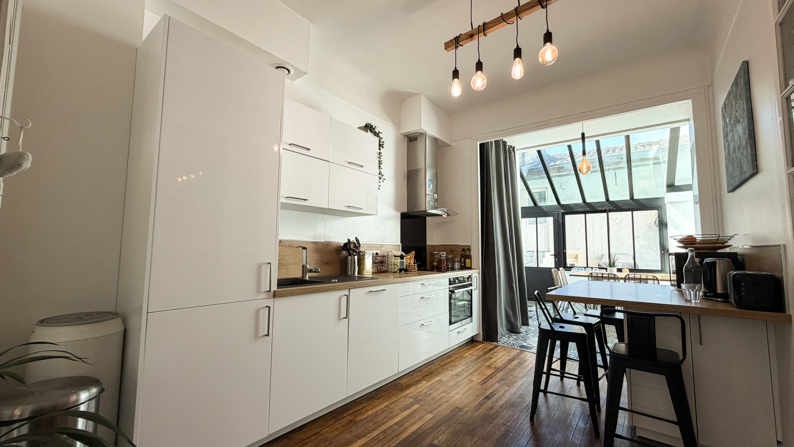Développant environ 110 m², elle s’organise autour d’un magnifique espace de vie traversant, composé d’un salon convivial, d’une cuisine ouverte et d’une salle à manger sublimée par une véranda habillée d’une verrière noire. Baigné de lumière, cet ensemble s’ouvre naturellement sur une cour intimiste d’environ 20 m², véritable havre de paix en cœur de ville.