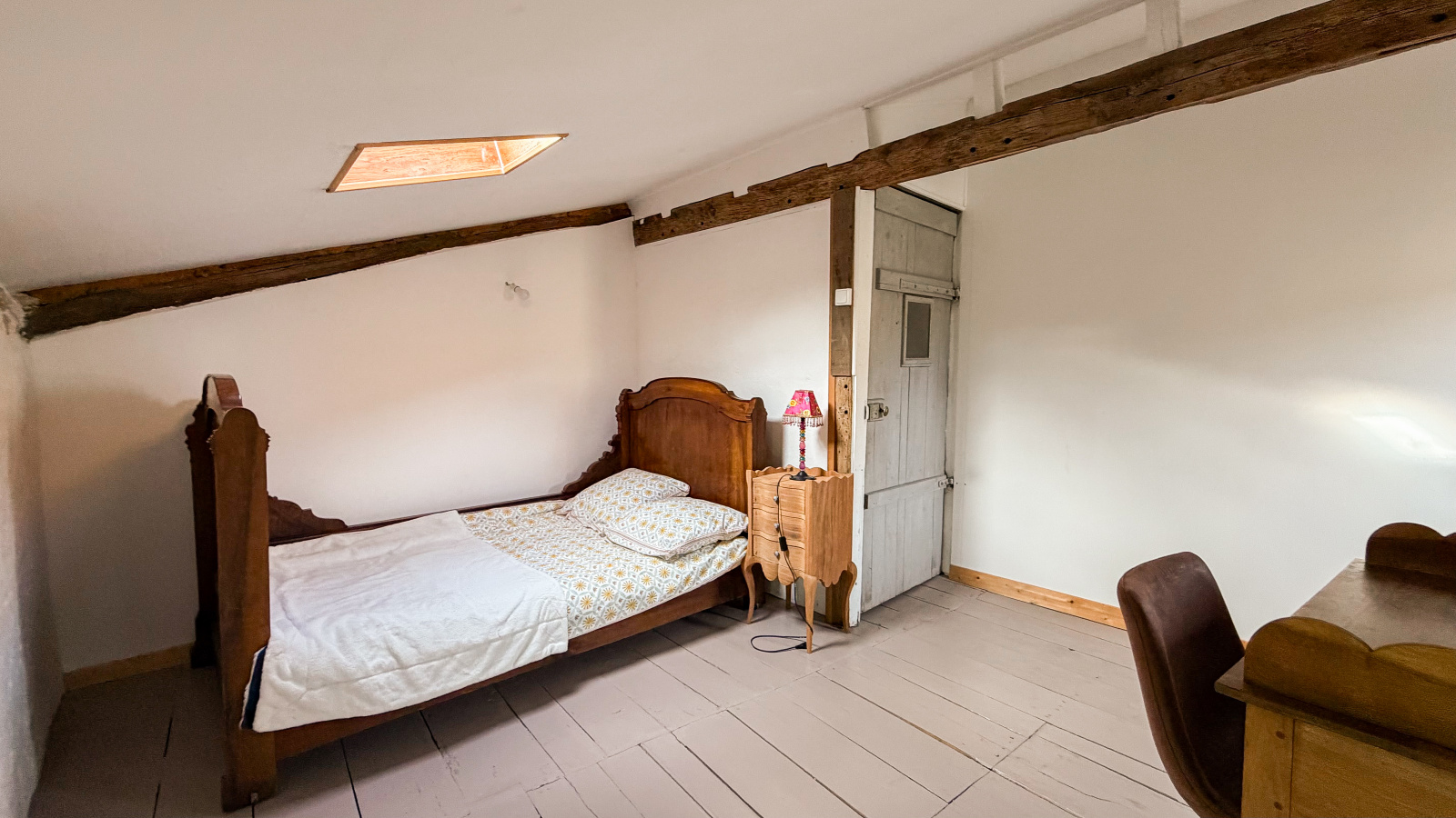Le deuxième étage accueille trois chambres supplémentaires, offrant de multiples possibilités d’aménagement : chambres d’enfants, chambres d’amis ou espace de travail. Chacune bénéficie de volumes agréables et d’une atmosphère chaleureuse, renforcée par les éléments anciens.
