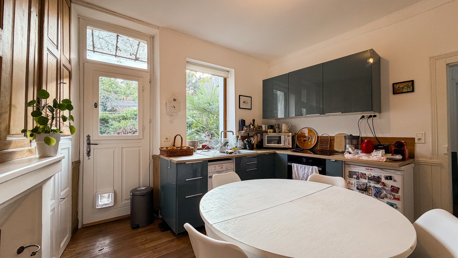 La cuisine, accessible directement depuis la pièce de vie, constitue un véritable coup de cœur. Elle conjugue harmonieusement le charme de l’ancien et le confort contemporain : boiseries d’époque et placards anciens conservés, cheminée ancienne devenue un élément décoratif fort, cuisine fonctionnelle et moderne parfaitement intégrée, belle luminosité et accès direct à un jardin d’environ 50 m², créant un lien privilégié entre intérieur et extérieur.