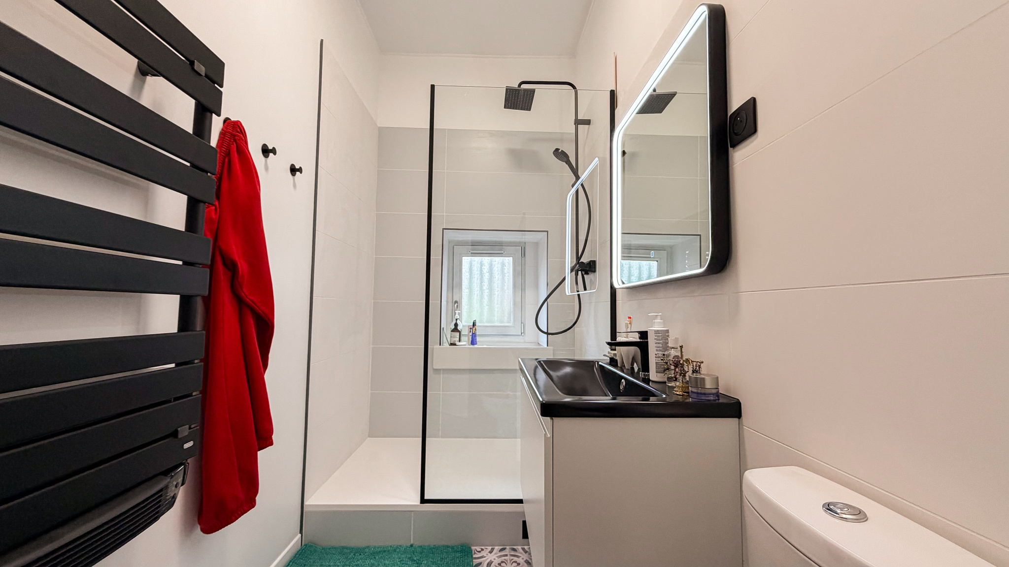 Au premier étage, une salle d’eau entièrement rénovée séduit par ses lignes sobres et contemporaines. Les matériaux choisis et la qualité de la rénovation en font un espace à la fois pratique et élégant, parfaitement intégré au cachet de la maison.