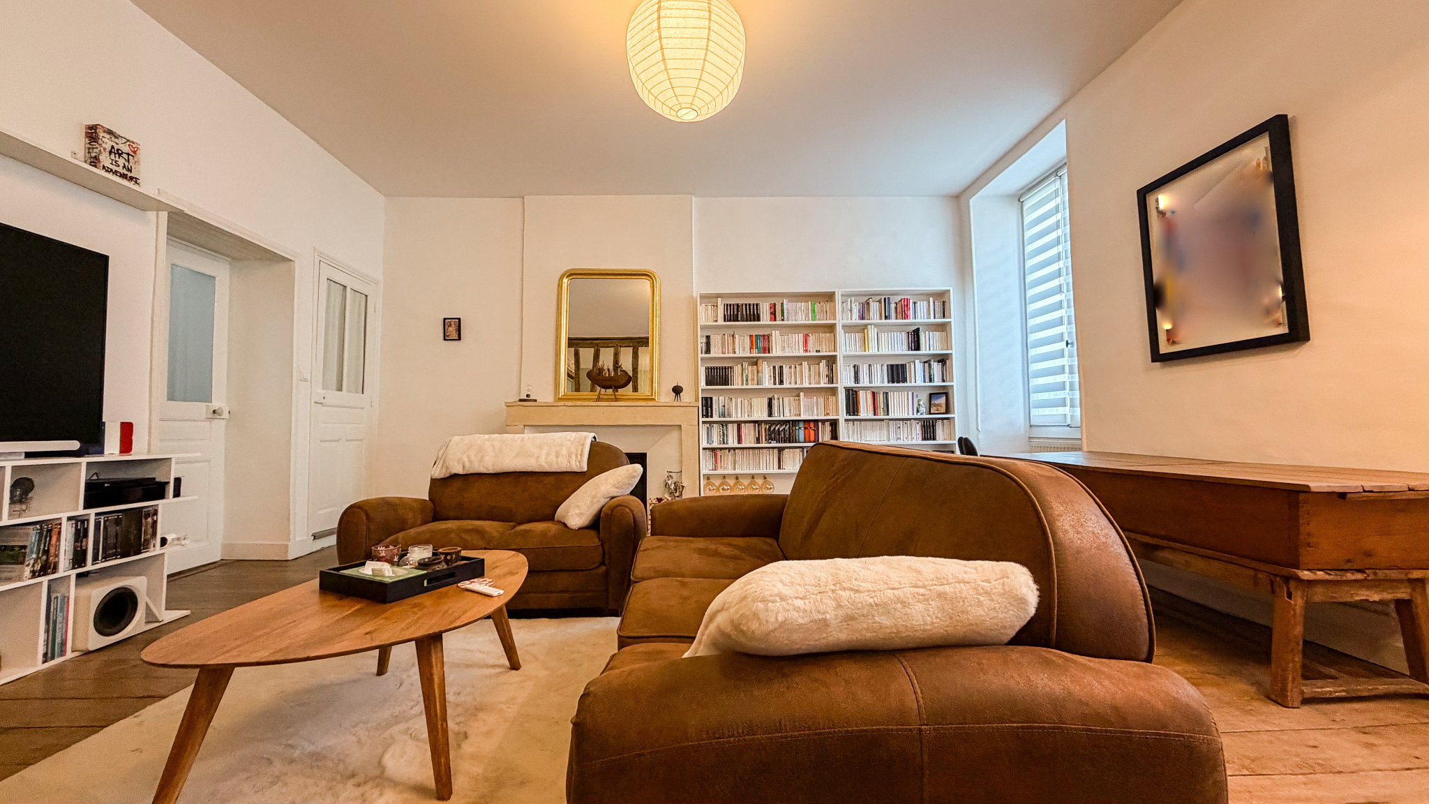 Le salon, à l’atmosphère douce et feutrée, est mis en valeur par de magnifiques poutres apparentes et des cheminées décoratives. Une séparation en bois ajouré, à la fois esthétique et authentique, structure l’espace avec subtilité.