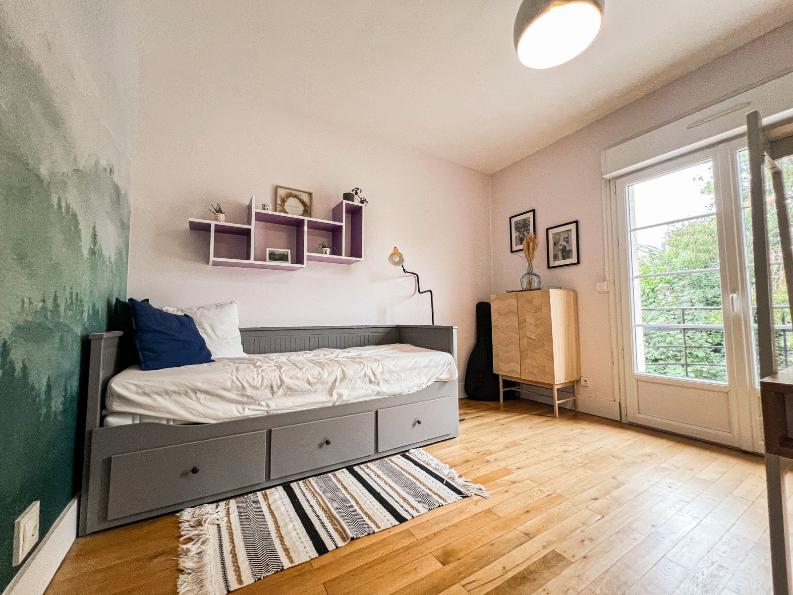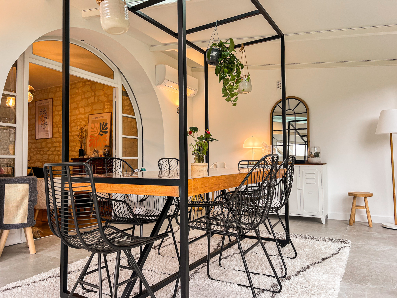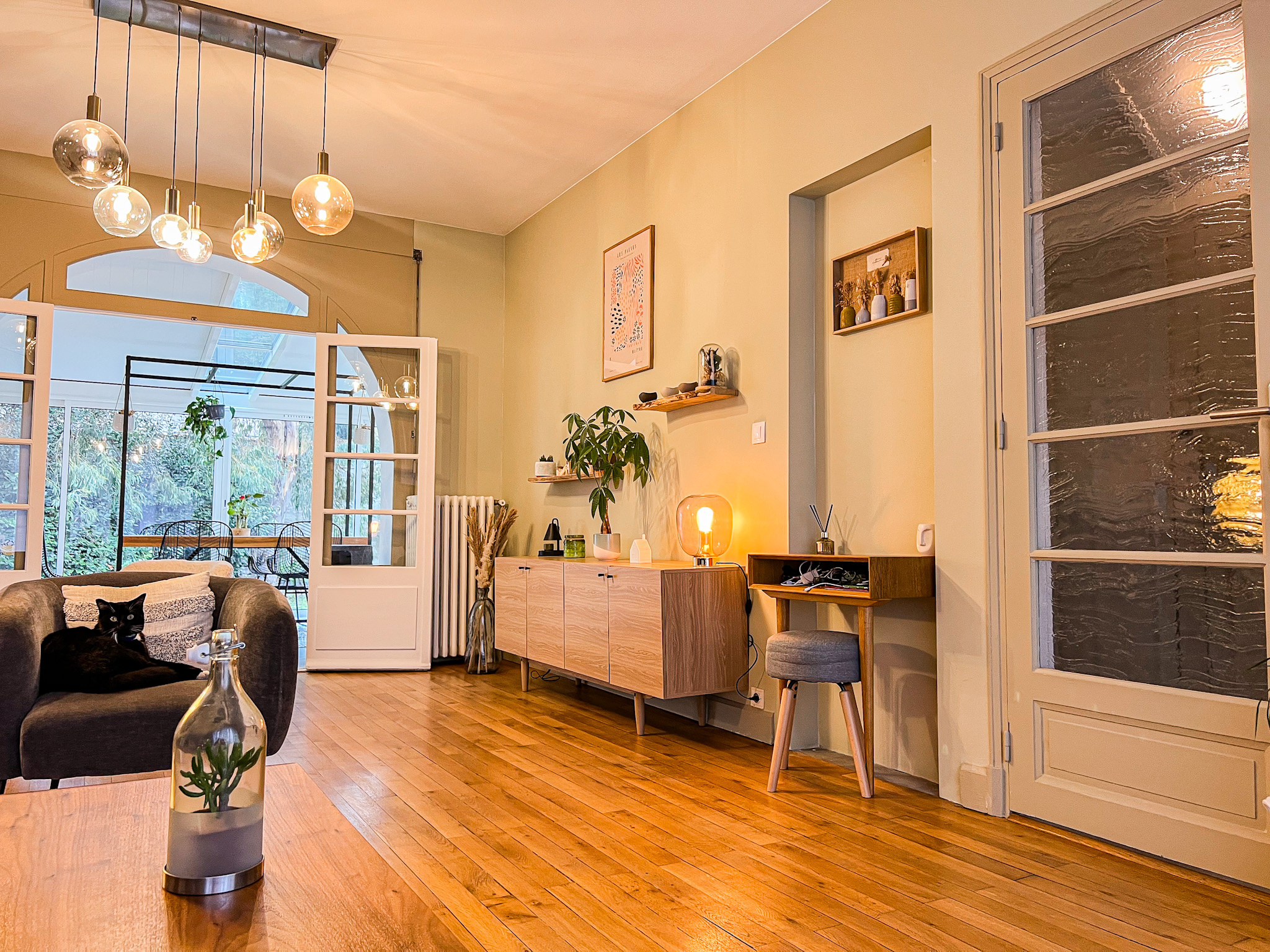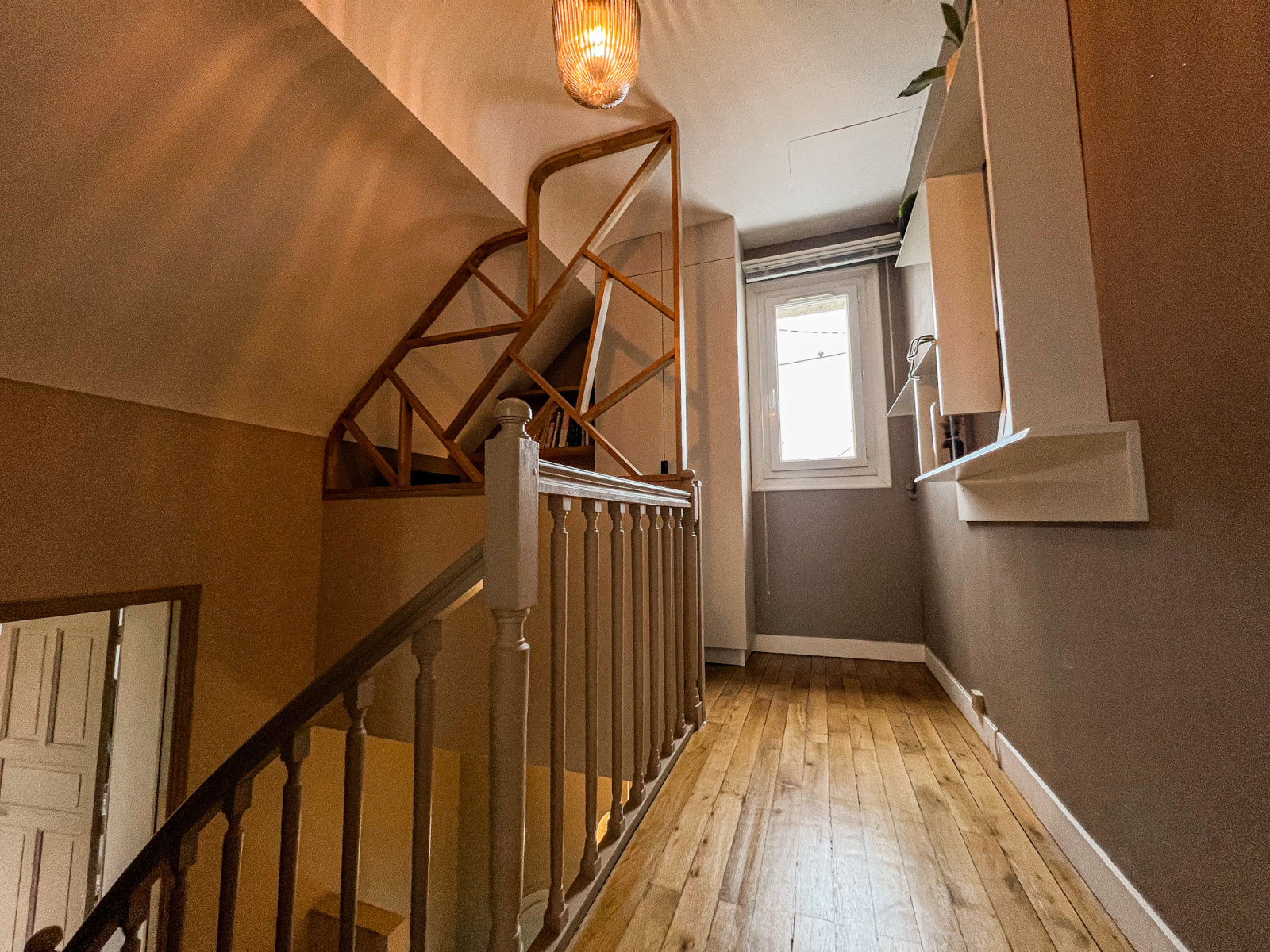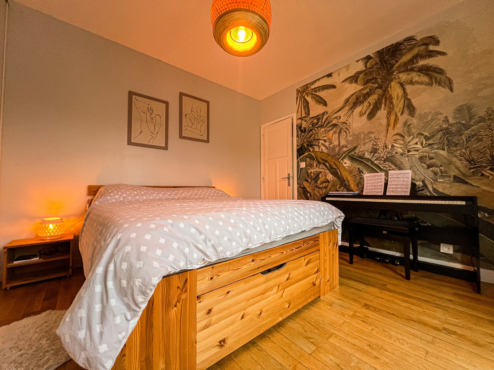 À l’étage supérieur, deux chambres lumineuses se partagent une salle d’eau rénovée où le charme rétro des années 60 s’harmonise avec des finitions contemporaines, offrant un style unique et plein de personnalité. Un coin bureau, réalisé sur mesure avec une élégante séparation en bois, complète l’espace.