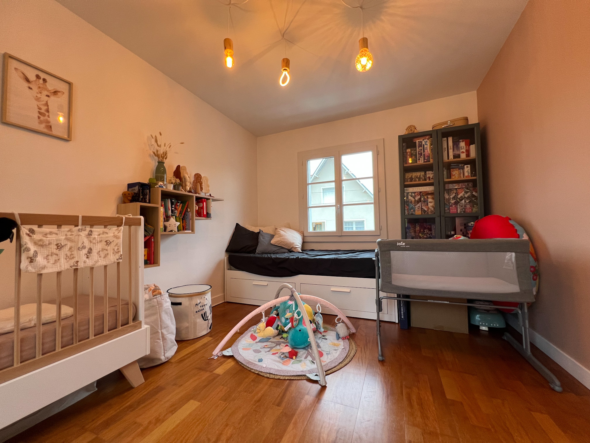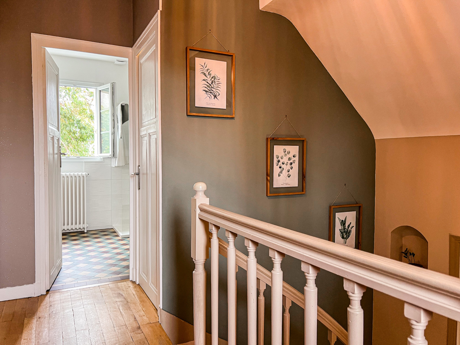 À mi-étage, une première chambre traversante au parquet parfaitement conservé.