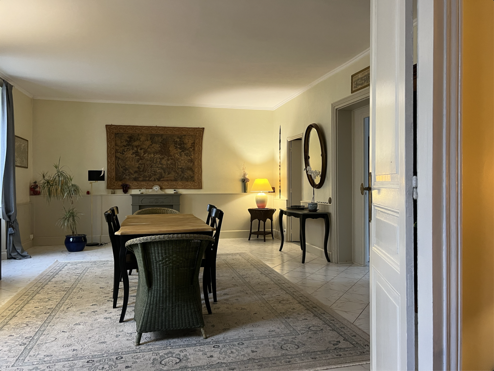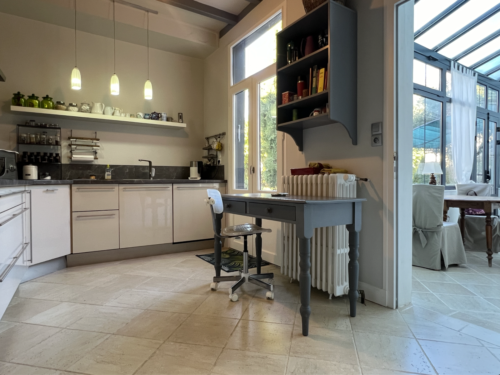Au rez-de-chaussée : l’entrée desservant un majestueux couloir menant à la véranda ouvrant sur le jardin. À droite de l’entrée, un bureau avec un cabinet de toilette et une buanderie, facilement transformables en chambre. À gauche, une vaste salle à manger et un salon invitent à la convivialité. La cuisine, avec arrière cuisine astucieusement connectée aux pièces de vie ainsi qu'à la véranda, facilitent le quotidien. Une cave accessible depuis l’arrière cuisine.